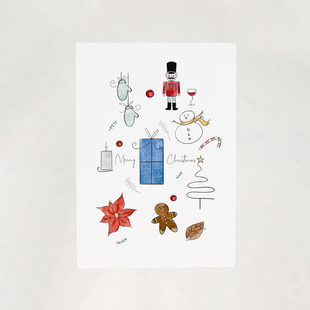 Diese Postkarte Weihnachten aus Recyclingpapier überzeugt mit ihrem liebevoll gestalteten Design, das von Vanessa in Vorarlberg gemacht wurde. Die kleinen Illustrationen eignen sich für Groß und Klein.